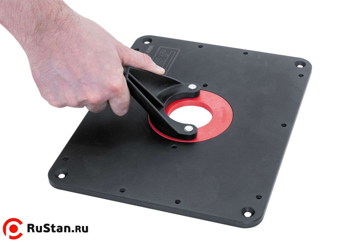 Прочная и жесткая дюралевая пластина 298х235х10 мм для крепления фрезера и установки в отверстие универсального чугунного фрезерного стола Jet 98600W или другого подходящего. Может использоваться для фиксации любых моделей ручных фрезеров – крепежные отверстия сверлят с обратной стороны «по месту». Для облегчения монтажа пластина оборудована юстировочными винтами по периметру, предназначенными для выравнивания плоскости со столом станка. С точки зрения удобства последующей эксплуатации оптимальны модели ручных фрезеров, оснащенные системой микролифта и блокировкой вала со стороны подошвы, например Triton TRA001.