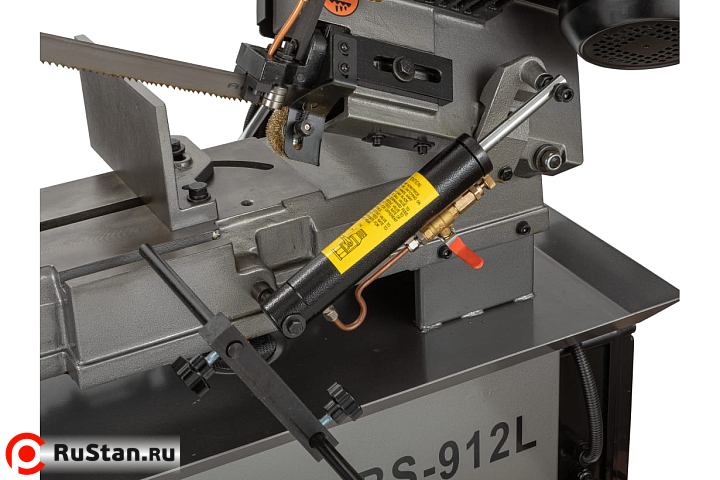 Модель HVBS-912L имеет регулируемые направляющие, предназначенные для прохода ленточного полотна в зависимости от формы заготовки и ее диаметра. Наличие направляющих предотвращает возникновение вибрации полотна, уход полотна в сторону. Направляющие укомплектованы блоком подшипников и твердосплавными сухарями, осуществляющими позиционирование полотна непосредственно под прямым углом к поверхности обрабатываемой заготовки. Качество пиления обеспечивается подачей СОЖ в зону резания. Сила натяжения полотна обеспечивается поворотом маховика, установленного в левой, торцевой части консоли. Ленточнопильный станок оборудован поддоном для сбора стружки и отработанной жидкости. Вес станка в полном снаряжении составляет 190 кг.