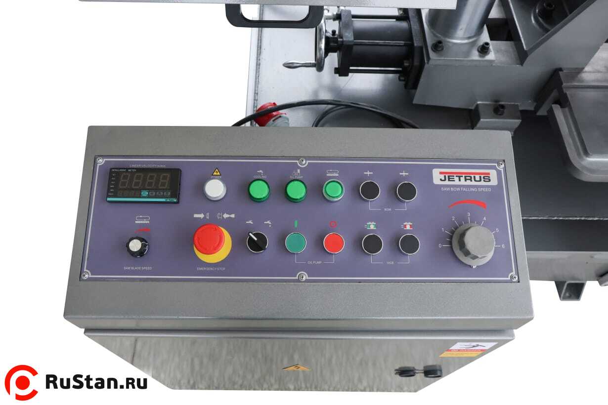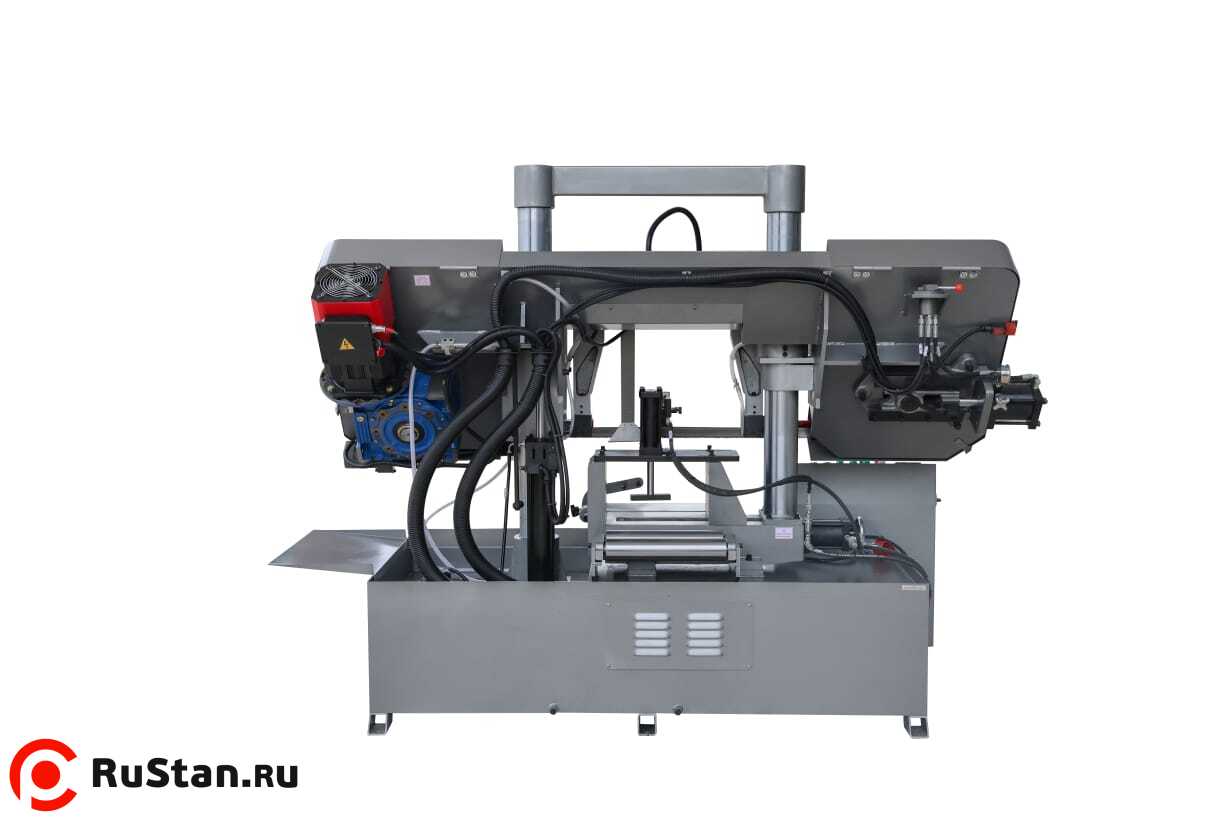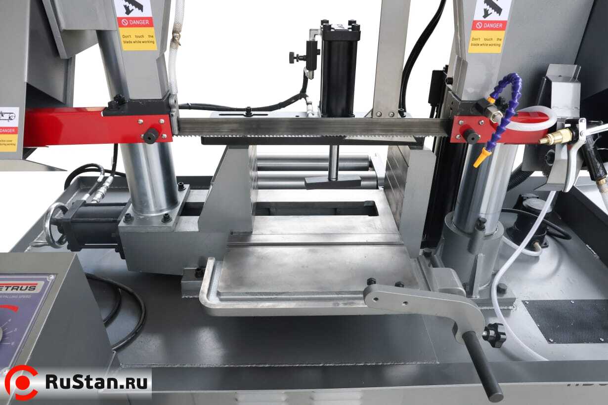Станок оснащён гидравлической системой подъёма и опускания пильной рамы с плавной регулировкой скорости подачи с пульта оператора. По окончании пиления концевой выключатель останавливает движение полотна, и рама поднимается в исходное положение.