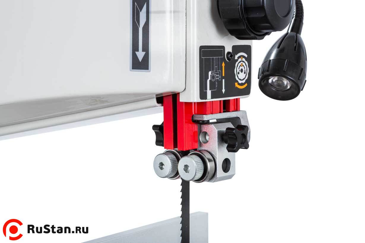 Станок оборудован регулируемым двухпозиционным параллельным упором. Он имеет две рабочие поверхности: высокую для перпендикулярных столу резов и толстых деталей и низкую для наклонного пиления и для плоских заготовок. Упор перемещается вдоль направляющего профиля с миллиметровой шкалой; для удобства позиционирования по ней, на корпусе сделан «целик», состоящий из увеличительного стекла с риской. Также в комплект входит скользящий угловой упор с направляющей вдоль Т-образного паза.