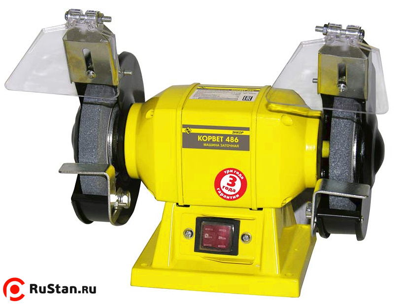 Станок оснащен мощным асинхронным двигателем. Хорошо сбалансированный вал и качественные подшипники исключают вибрацию и шум при работе. Отсутствие вибрации и резиновые опоры позволяют использовать станок без дополнительного крепления к верстаку. Безопасность при работе обеспечивают два широких защитных экрана. Для удобства в работе имеются регулируемые упоры. Станок комплектуется переходными кольцами для заточных кругов с посадочным диаметром 32 мм.